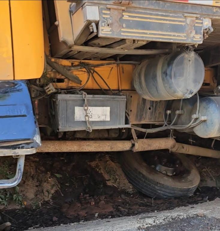 Caminhão que transportava paletes de madeira sofre uma falha mecânica e veio a colidir com o barranco.