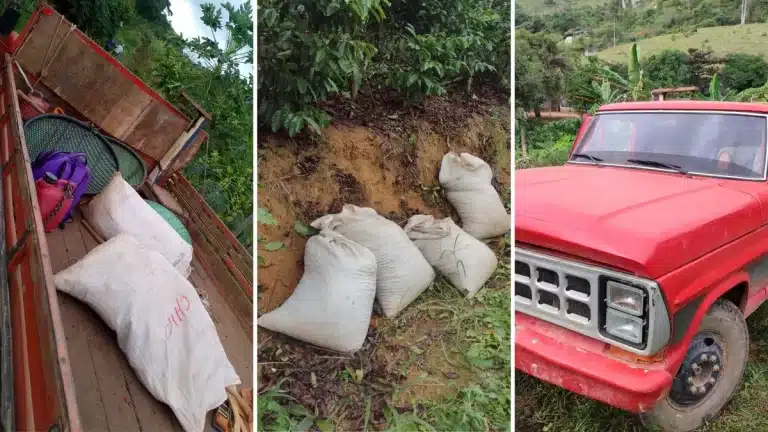 Vinte sacas de café foram colhidos sem autorização em Vargem Alta, no Sul do ES Crédito: Divulgação/Polícia Militar Três homens foram detidos após